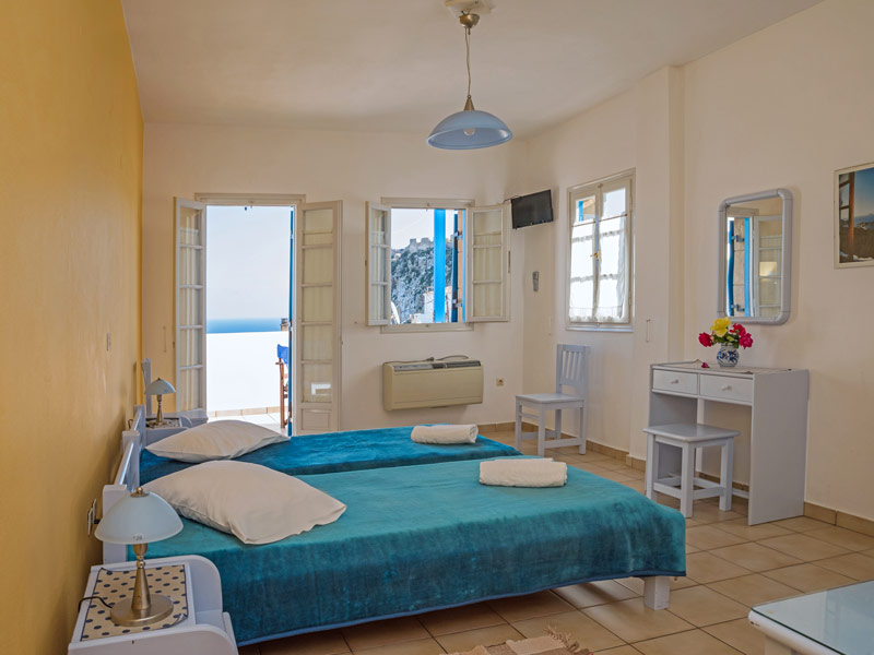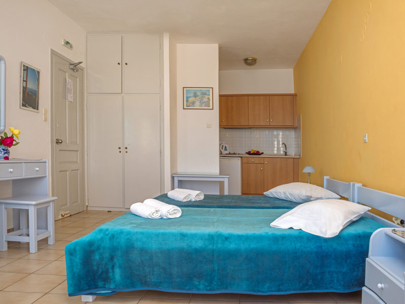 Castello Studios & Apts is placed near the church of Estavromenos which is a well frequented point in the town of Chora. The complex has 8 rooms, studios & apartments which are painted in the traditional blue-white colours, influenced by the greek tradition. All of them offer great location to the close points of interest and most of them offer great views to the Venetian castle of Chora or the bay of Kapsali. All rooms are equipped with telephone, air condition, mini fridge, tv, WIFI, hair dryer and daily cleaning service.